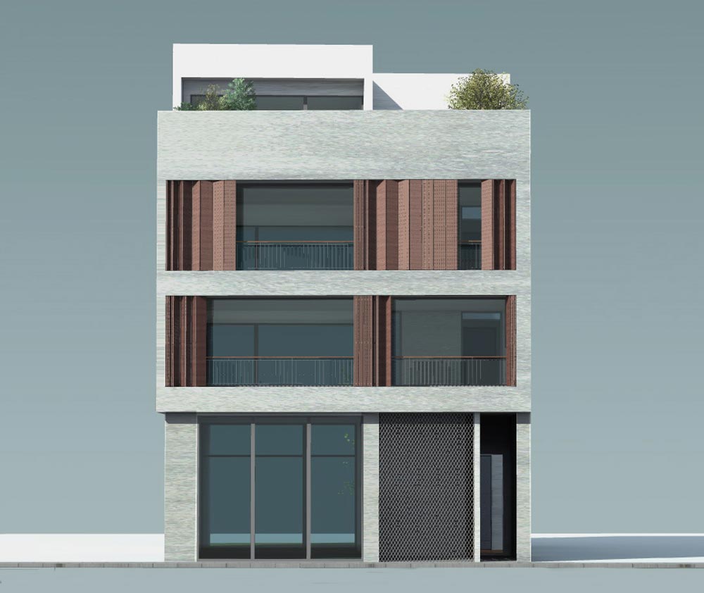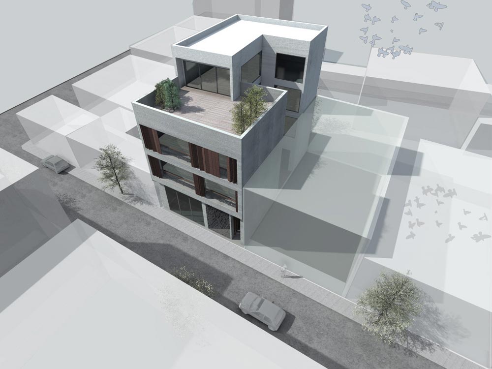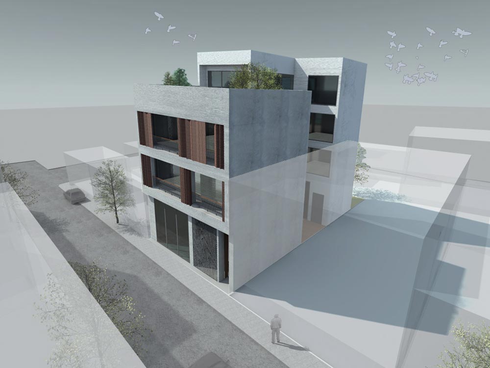 The site faces a small street in the busy central area of Gkazi, Athens. The design objectives were to create a building which could be isolated from the street and face into internal courtyards and at the same time could blend with the existing low-rise and warehouse buildings.