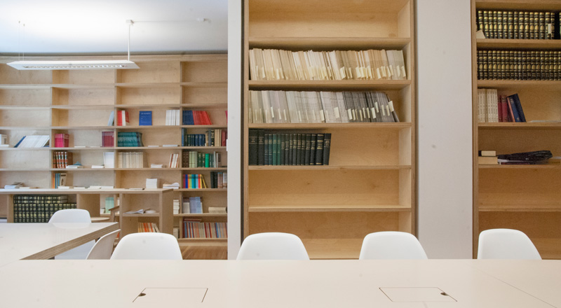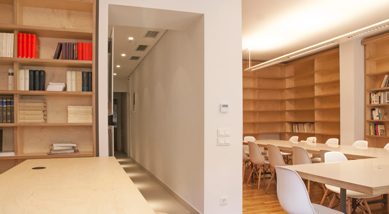 Founded in a 1930s modern apartment building next to the National Archeological Museum, its special book collection (over 18K titles) needed to be re-categorized and open to the public. Its new space provides a maximum library capacity, a study-seminar hall, administration offices and a conference room.
