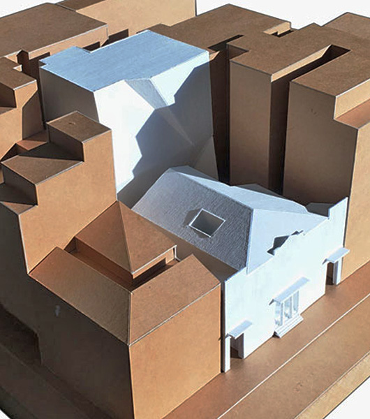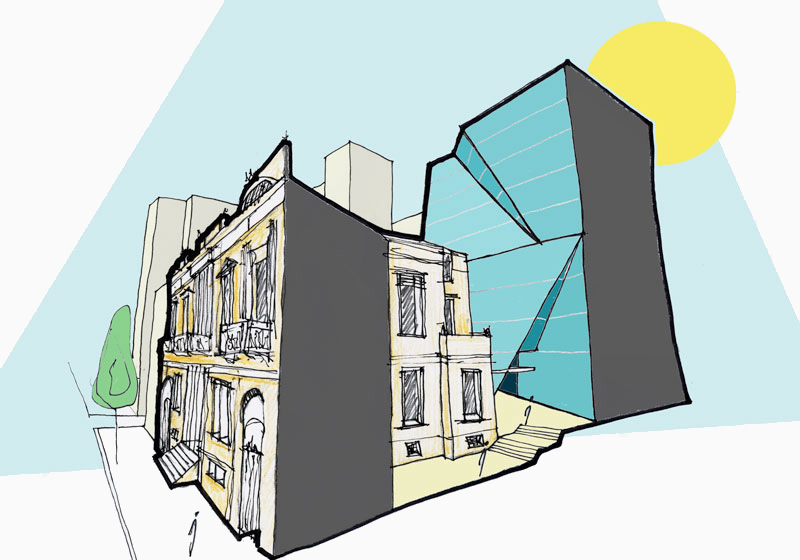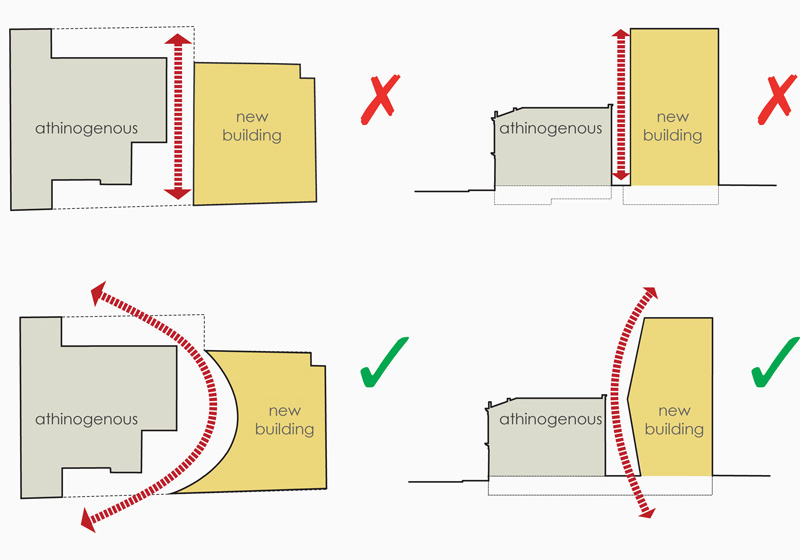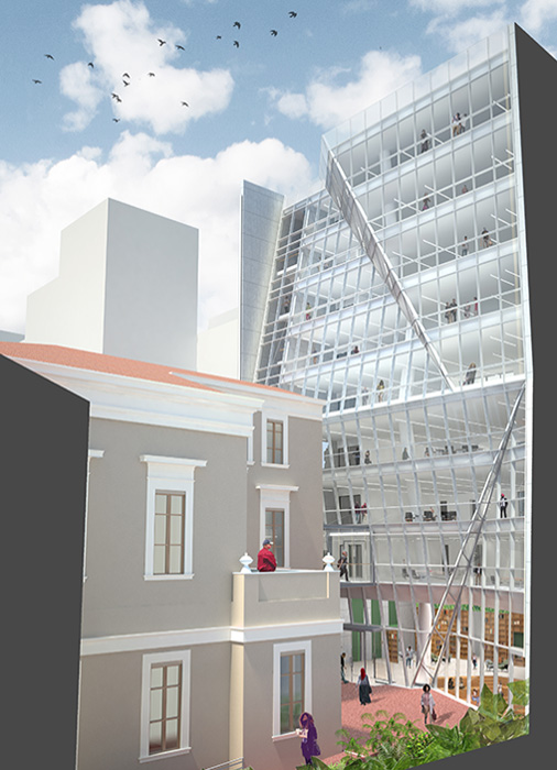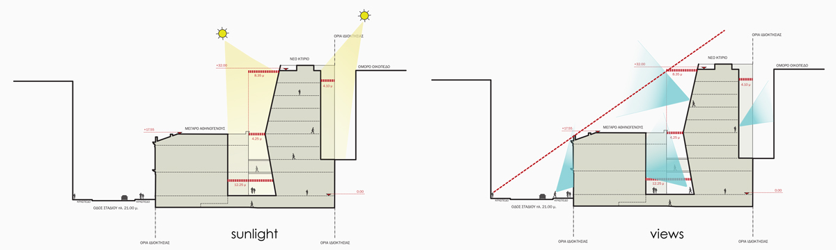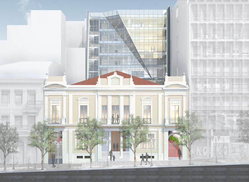 Exploiting the whole of its plot, a new building is organicly added at the back of Megaro Athinogenous generating a new ensemble that respects and gives prominence to the monument while at the same time creates an up to date building that can respond to the modern requirments.