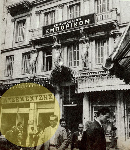 ‘Manas Kouzina-Kouzina’ is located on the ground floor of the abandoned for decades though recently restorated neoclassical hotel ‘Emporikon’ on Agias Eirinis square in the center of Athens.