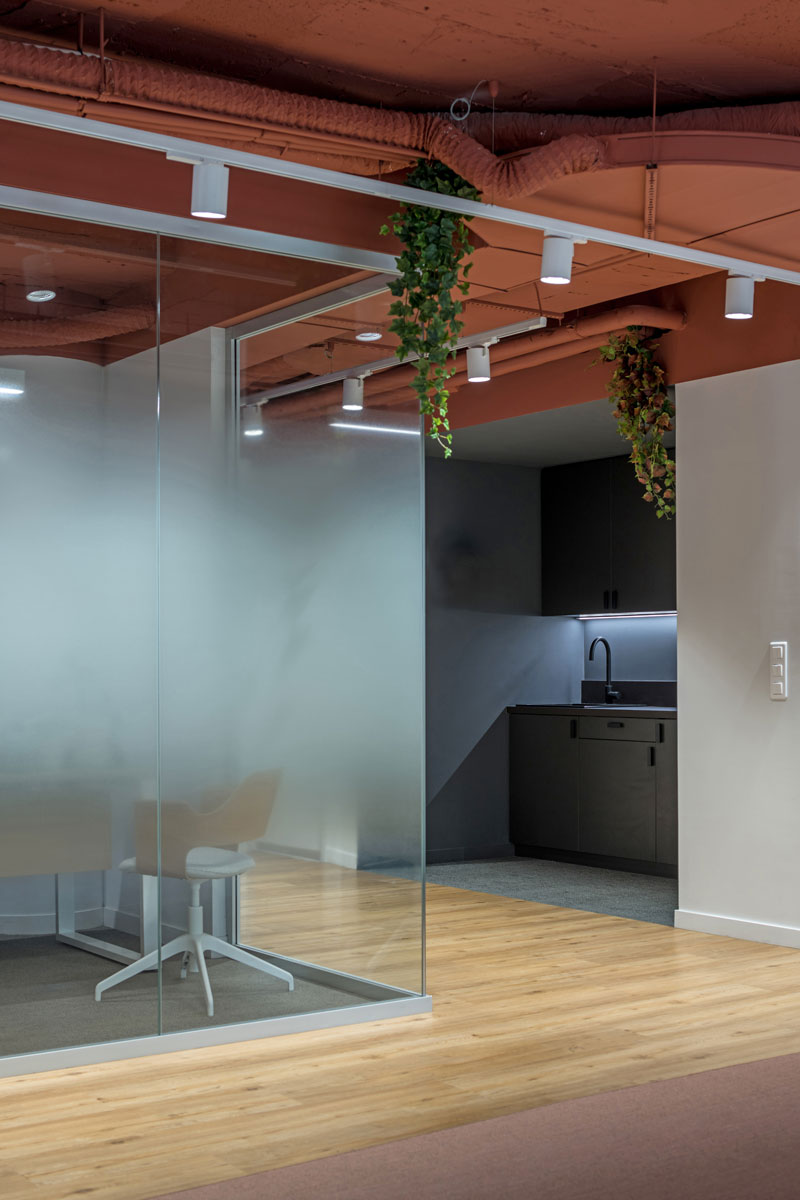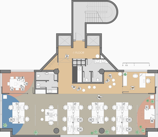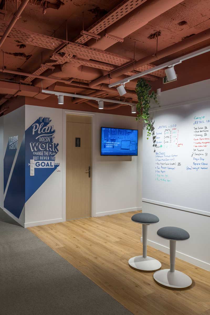 The second design strategy was to generate a strong and dominant element through the whole building offering a contemporary spatial experience and a vivid corporate id. The concrete ceiling was unveiled, the existing mechanical infrastructure was upgraded and everything together got painted in a peachy tone that unifies the working space on each floor while creating a strong spatial id aiming to generate positive feelings and motivational behaviors. The floor design distinguish the diverse functions and propel a more user friendly flow through the open space.