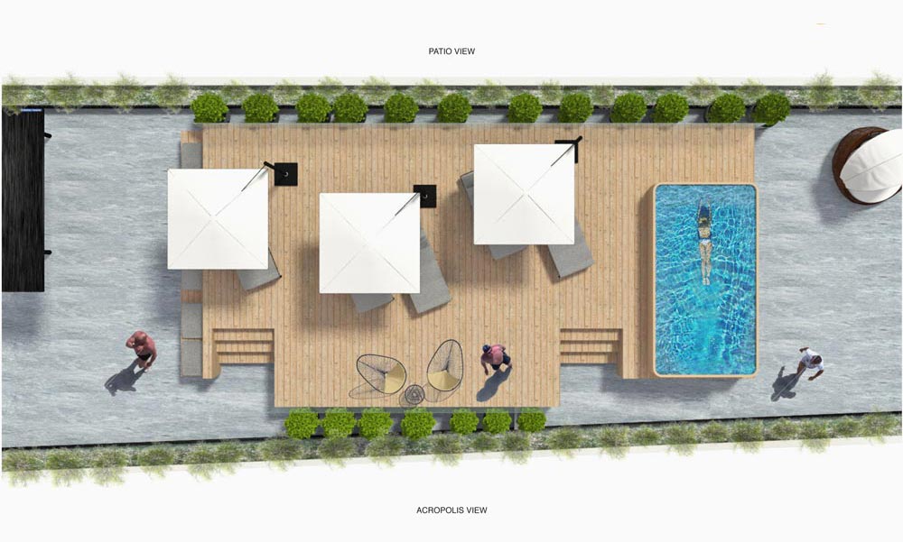 The big terrace with the Acropolis view, the swimming pool and the two sitting areas under their canopies is completing the penthouse’s luxury demands.