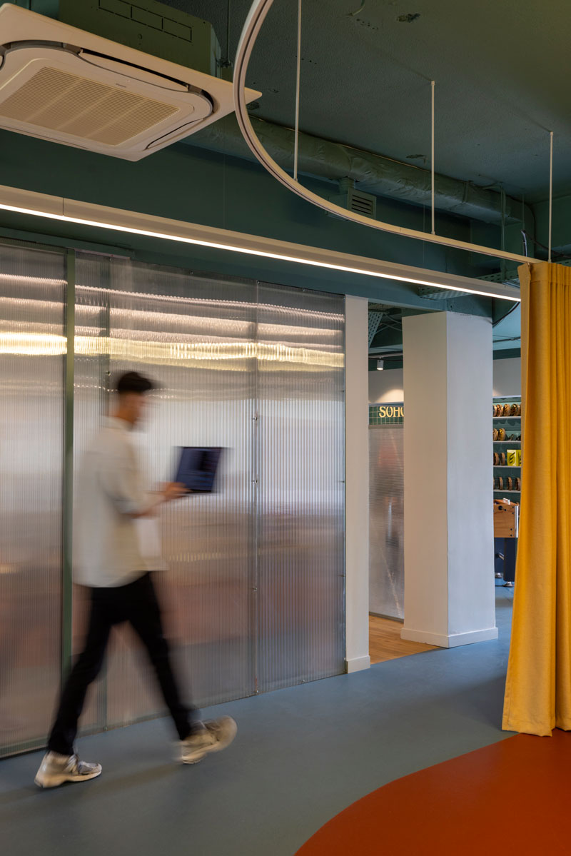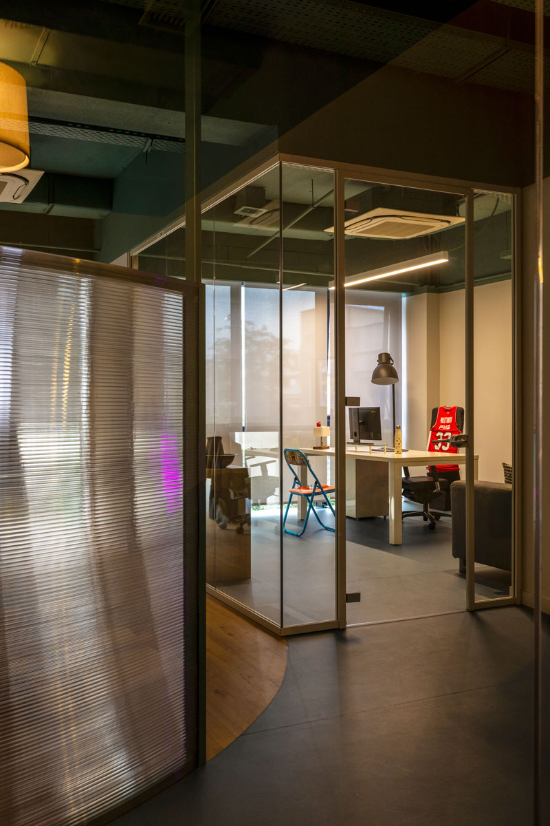 The architectural concept focused on exposing the existing space -both literally and metaphorically - and introducing an open-plan approach with custom, arched, polycarbonate made, light-structure functional dividers that ensure smooth operation across all departments while maintaining interaction between them. By removing the existing internal walls and suspended ceilings, the structural elements and infrastructure were revealed, forming continuous spaces that promote collaboration and exchange. A deep green color was used to unify everything on the ceiling as a design tool for identity and spatial organization. The floor plan was organized into distinct zones corresponding to the company’s functional units - areas for creative teams, management, meetings, and relaxation. Smooth transitions between zones are achieved through subtle curved changes in color and materials. The curved floor transitions create an open dialogue of free forms though out the workspace.