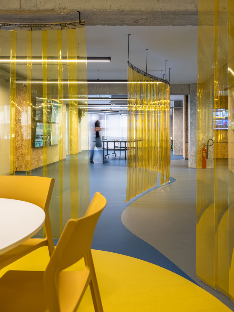 Their new HQs are located in two stories of a former social services building in northern Attica. Its two stories had completely different structure, thus the need was to create a unified branded experience for all employees & visitors. The main design gesture was to create remarkable spatial experiences with the use of common materials. The industrial materiality blended with a colorful floor that highlights different facilities, flows and zones offers a friendly working environment and a statement for the company. The blue color prevails on the floor of the common areas as Vermantia’s signature color while all meeting spots are standing out on their yellow floor. The yellow pvc curtains act as colored light filters between different zones and uses while guiding the user through the space.
