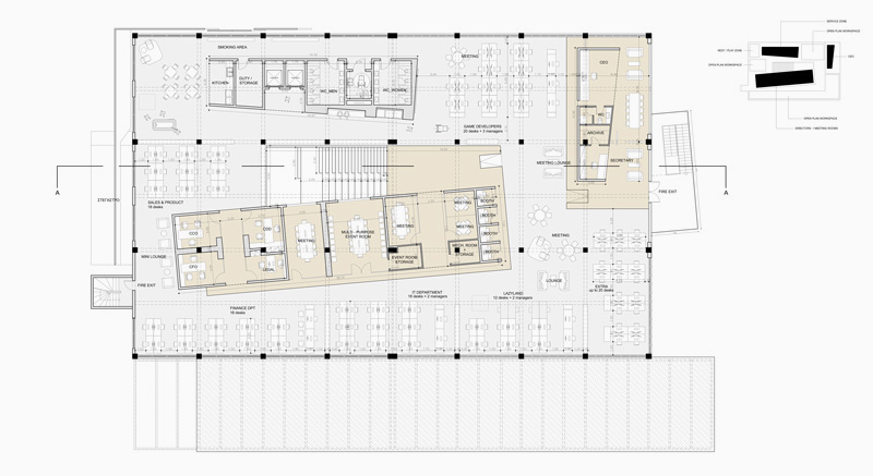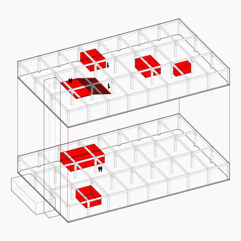 Τhe starting idea was to preserve and emerge the industrial character of the building. Exploiting the big open space and the double height, the proposal organizes all the C level offices and meeting rooms in closed free standing wooden boxes placed at the center while the rest of the offices are installed in diverse open space groups .