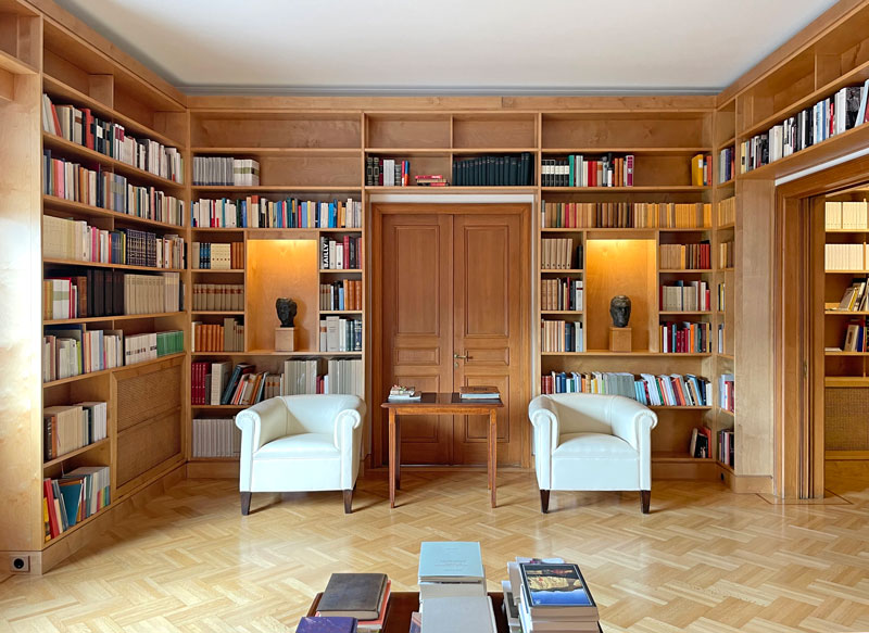 Minimal, full height libraries with continuous linear shelves running from on room to the other offer the illusion of a large unified space while creating a warm atmosphere through its layout and materiality.