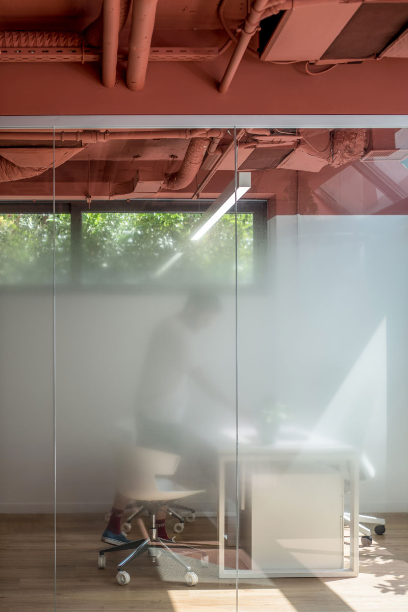 The second design strategy was to generate a strong and dominant element through the whole building offering a contemporary spatial experience and a vivid corporate id. The concrete ceiling was unveiled, the existing mechanical infrastructure was upgraded and everything together got painted in a peachy tone that unifies the working space on each floor while creating a strong spatial id aiming to generate positive feelings and motivational behaviors. The floor design distinguish the diverse functions and propel a more user friendly flow through the open space.
