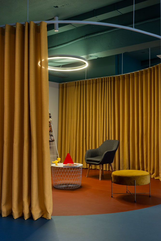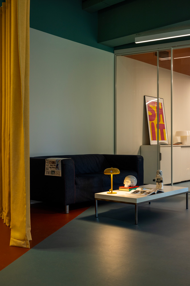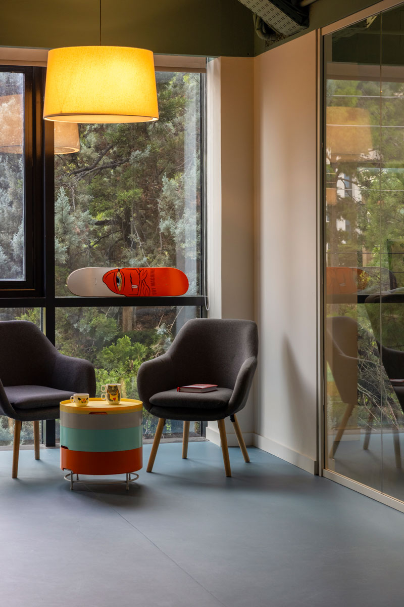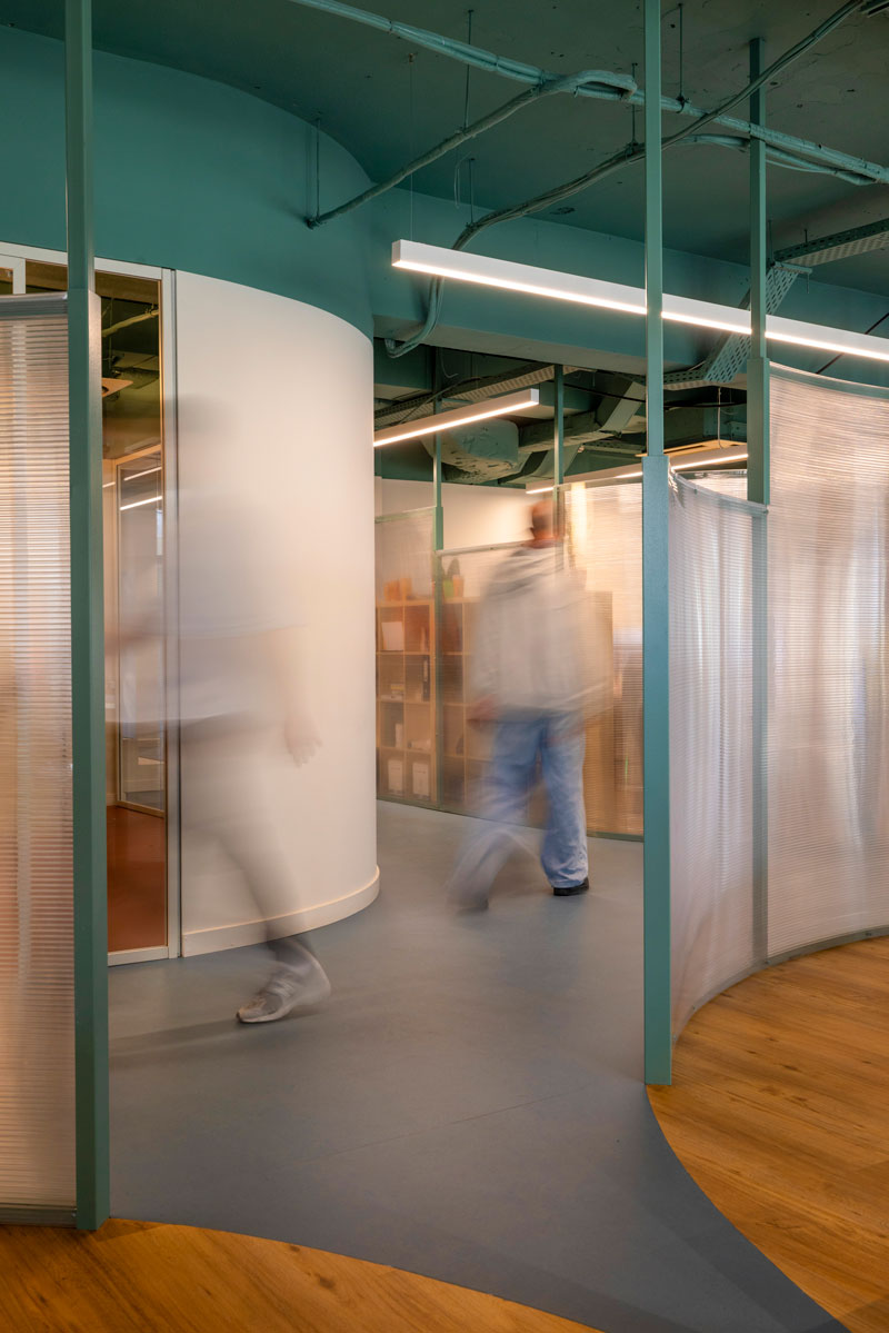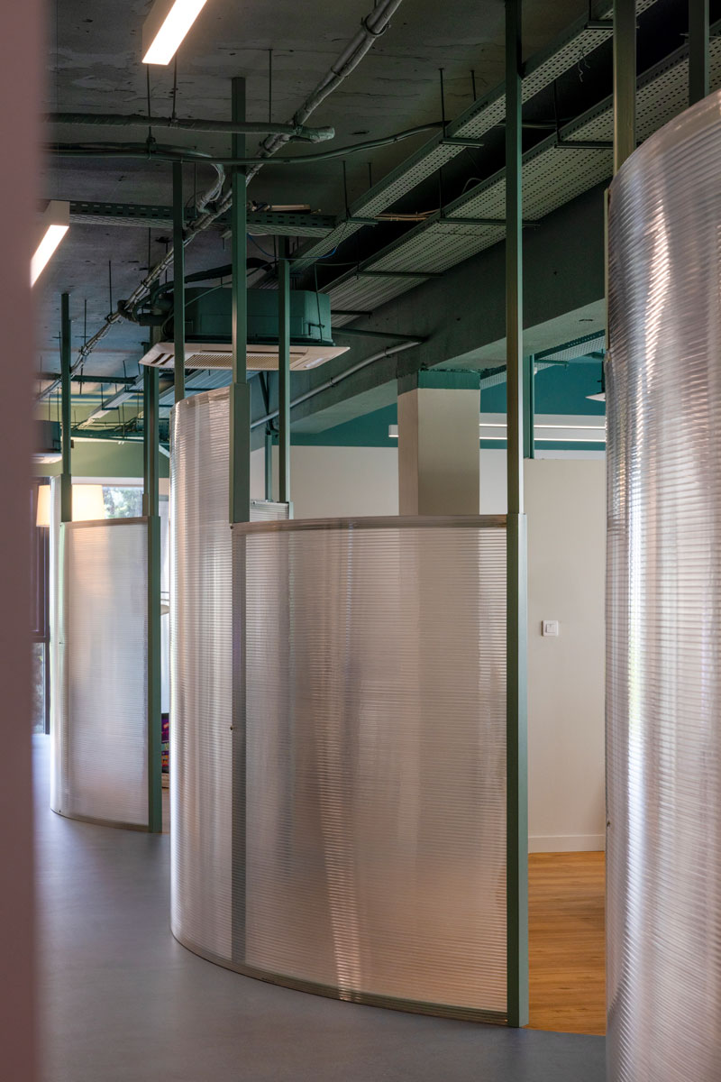 The architectural concept focused on exposing the existing space -both literally and metaphorically - and introducing an open-plan approach with custom, arched, polycarbonate made, light-structure functional dividers that ensure smooth operation across all departments while maintaining interaction between them. By removing the existing internal walls and suspended ceilings, the structural elements and infrastructure were revealed, forming continuous spaces that promote collaboration and exchange. A deep green color was used to unify everything on the ceiling as a design tool for identity and spatial organization. The floor plan was organized into distinct zones corresponding to the company’s functional units - areas for creative teams, management, meetings, and relaxation. Smooth transitions between zones are achieved through subtle curved changes in color and materials. The curved floor transitions create an open dialogue of free forms though out the workspace.